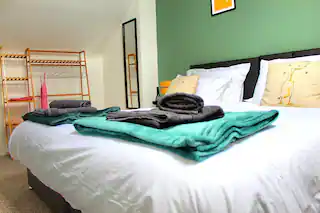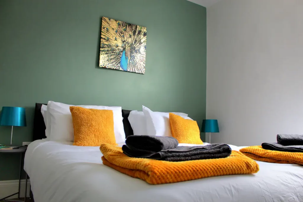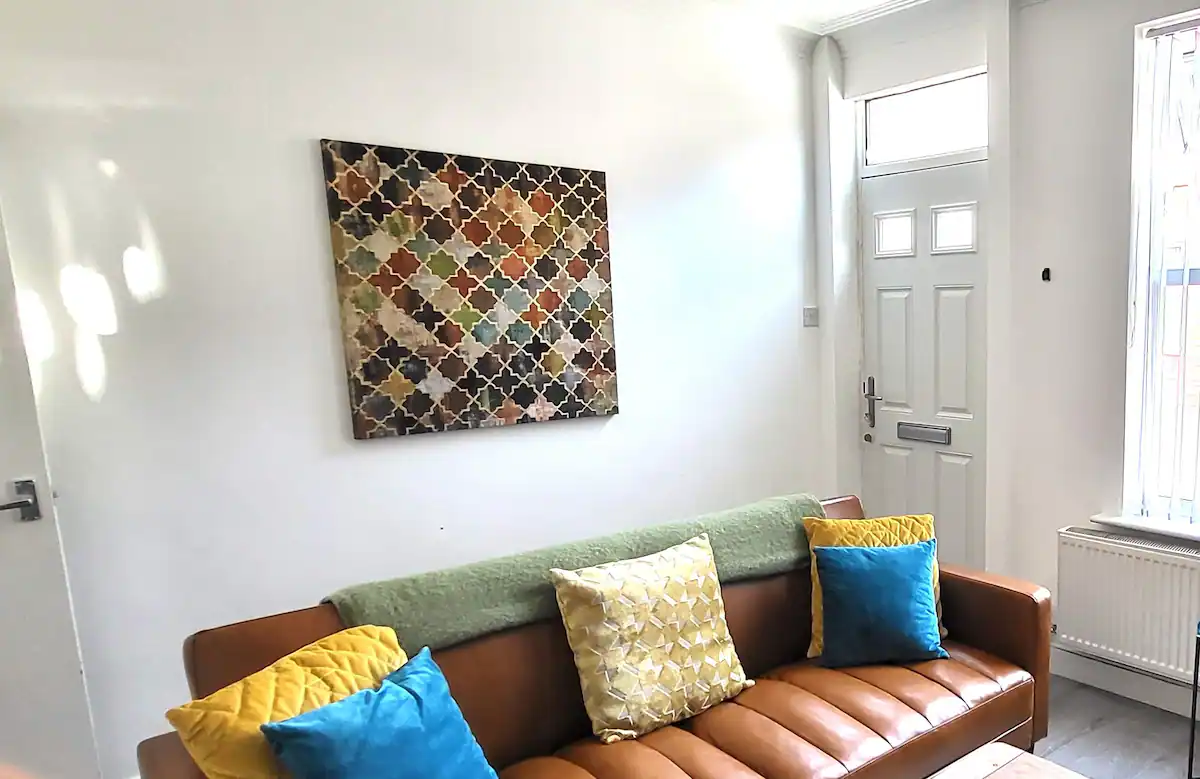 The property is a mid-terrace with plenty free street parking for those arriving by car. Wi-fi is included in the price of the stay. In the lounge you’ll find a contemporary leather sofa-bed for two, two upholstered comfy chairs and a coffee table, there is also a good size smart tv, a dvd player and a reading lamp and a couple of side tables to rest your tea mug or a book on. The dining room is connected to the kitchen and has a lovely glass table with 6 modern chairs and a beautiful retro lamp with a side cabinet. The kitchen is fully equipped for preparing delicious meals and there is a microwave, dishwasher and a washer/dryer for your convenience. There are 3 double bedrooms in the house, two on the first floor and one on the top floor. They all have shelves and hangers to keep your clothes and fresh linen is of course provided. The top floor bedroom is the brightest of them all, with a lovely sky light and plenty of room. The bathroom is situated on the first floor and we also provide you with fresh towels and a bath mat to use during your stay. To the back there is a small patio with a table and chairs that can be enjoyed on a hot day or a quick sneak out.